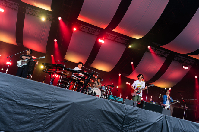 今年は全国各地のフェスのラインナップに名を連ね、先述のマカロニえんぴつと共に2022年を代表するアーティストの一組と言っても過言ではない二番手のVaundy。岸田が「2022年、一番歌がうまいと思った」と称賛すれば、佐藤が「本当に老若男女のファンがいるのがすごい」と感嘆の声を上げるのも納得の才気溢れるパフォーマンスを冒頭から展開し、「不可幸力」「踊り子」では自ずとハンズアップが巻き起こる。くるりとも縁の深いドラマー・BOBOのリズムに支えられ、きらめきと切なさが同居する「恋風邪にのせて」や叙情の極みたる「走馬灯」など、比類なきソングライティング力をまざまざと感じさせていく。その後も、「裸の勇者」「東京フラッシュ」とやる曲やる曲キラーチューンとも言うべきセットリストで畳み掛け、「雨降り過ぎじゃね?」と時折、客席を気遣いながら、「ラストスパート、いきましょうか!」と「花占い」「怪獣の花唄」で怒濤のエンディング! 2000年生まれの次世代のポップスターここにありと証明した、初出演にして鮮烈なステージだった。
