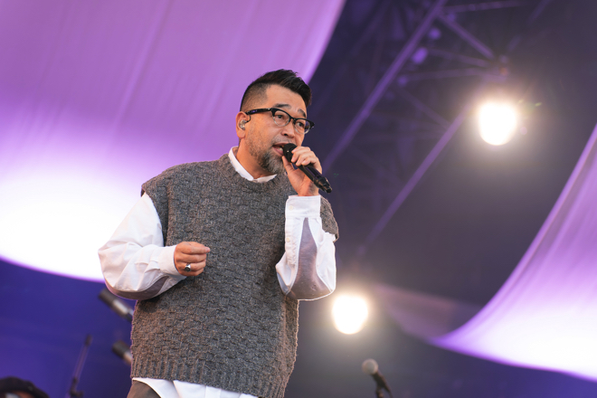 くるりより上の世代のレジェンドとのマジカルな化学反応も<音博>の見どころの一つだが、今年その役を担うのはご存じ、槇原敬之。佐藤が「知ってるけどライブで見たことがない曲を味わえるのが<音博>」と言えば、岸田が「中学生ぐらいの頃に夢中で聴いてました」と返す期待感を受け、いきなり涙腺を刺激する名曲「遠く遠く」からライブはスタート。梅小路公園に手のひらが舞う絶景を生み出したかと思えば、あのピアノのイントロに一同がざわめいた「どんなときも。」と、たった2曲で今日ここにいてよかったと心底思わせる、槇原敬之の音楽の力に包まれる。「くるりのおかげで、今日のこの場所でコンサートができること、本当に幸せに思ってます。見えてます〜?(と手を振る) ちゃんと届くように歌いますので」と、見る者を優しくすくい上げるMCに続いては「LOVE LETTER」へ。先の佐藤の言葉通り、脳裏に刻まれたグッドメロディが次々と目の前で蘇っていく。レパートリーから新旧のアーバンポップを聴かせた「Fall」「Hungry Spider」、無数に伸びる手が声の代わりとなった「僕が一番欲しかったもの」、そして、国民的ヒット曲「世界に一つだけの花」と、曲を追うごとにピークを超えていく。ラストは「新しい世界にみんなで行こうという気持ちで作りました」と語った壮大で力強い「宜候」、愛に満ちた「四つ葉のクローバー」で、くるりへとバトンをつないだ。