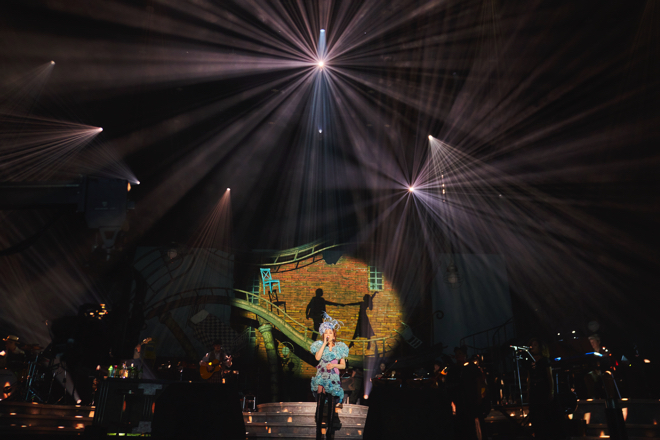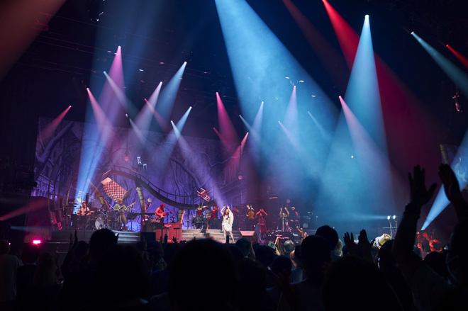 本公演は、<不思議の国のジュジュ苑 -ユーミンをめぐる物語- JUJUの日スペシャル 演出:松任谷正隆>と題して、まさにスペシャルな構成で行われた。デビューシングル「光の中へ」で幕を開けると、アルバム『ユーミンをめぐる物語』には収録されていない楽曲も披露しながらユーミン×ワンダーランドへと誘っていく。さらに本編では本ツアーでは初めてとなる「ひこうき雲」が披露され、ファンの盛大な拍手で会場は包まれた。