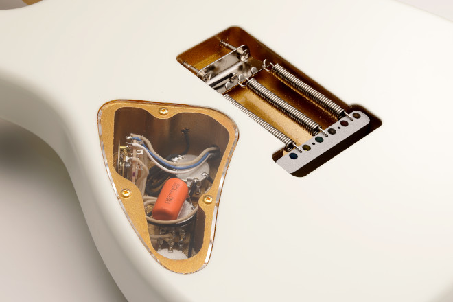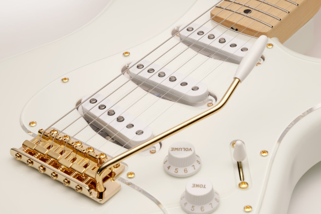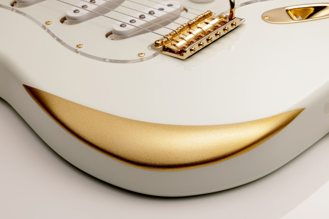 「フェンダーチームとはこれまでにも何本かシグネイチャーモデルを開発してきました。その中でも今回の『Ken Stratocaster Experiment #1』は、そのモデル名通り“実験的”な一本になりました。和をイメージして磁器のような白に金を配したこのギターは、ブリッジを僕が実際に使っているギターと同じ音色に近づくように、単品では手に入らないPure VintageのGoldを付けてもらったり、ピックアップをボディに直付けにして振動を上手くひろうようにしました。それから、より太みのあるサウンドを鳴らせるよう通常ストラトにあるコンター加工を最小限にしたり、ネックをこれまでのギターよりもさらに太くしたりしました。今の自分がいいなと思ったことや試したい実験的要素を詰め込んだ『Ken Stratocaster Experiment #1』、 色んなギタリストに思いきり遊んで欲しいですね!」