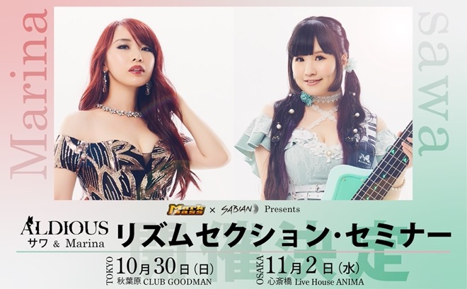 Aldiousのサワ(B)とMarina(Dr)による<Markbass × SABIAN Presents リズムセクションセミナー>が東京と大阪で開催される。