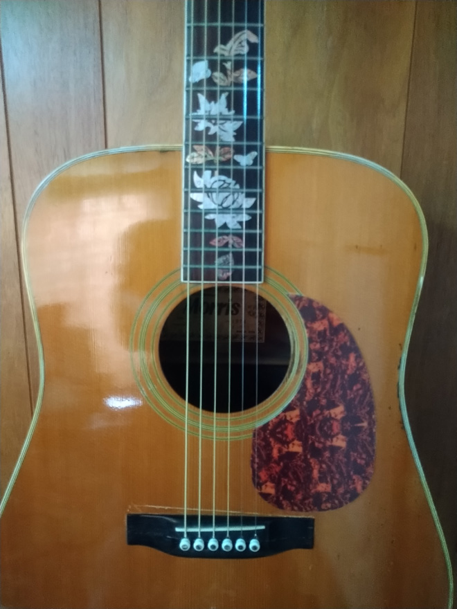 写真のW-25は、ピックガードをべっ甲柄、ブリッジピンを牛骨インレイ付に変更、ヘッドと指板にインレイシールを貼るなど遊び心を加えてみました。ギターはいいですよね。楽しいですよね。いつの日か弾けなくなる日がくるまで楽しみたいと思います。