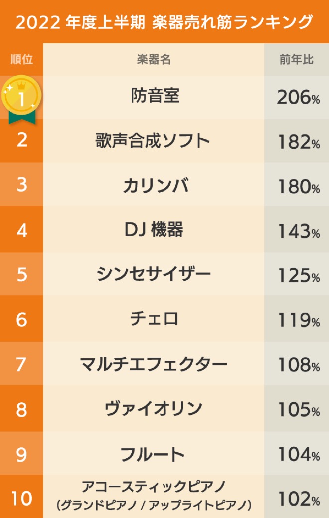 【島村楽器調べ】歌声合成ソフトが急上昇、Withコロナで防音室は今年も好調「2022年度上半期 楽器売れ筋ランキング」