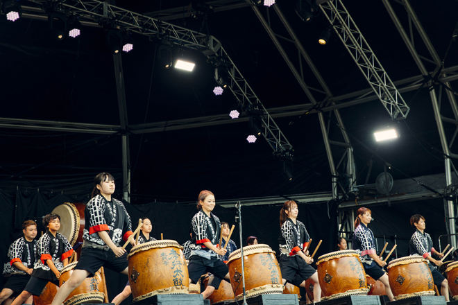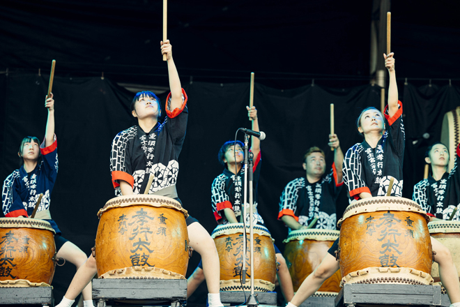 ついに開演を迎えると、メインステージであるRAINBOW STAGEに朝霧JAM実行委員長の秋鹿 博氏が登場し挨拶をした。2019年は台風の接近に伴う悪天候により開催中止、2020年および2021年は新型コロナウイルスの影響により開催は見送りになっていた朝霧JAM待望の幕開けを前に、「朝のない夜はない」と説得力のありすぎる名言を放つと、『水戸黄門』の主題歌を歌い人生のロマンと勇気について伝えた。加えて、2日目に最後の野外フェス出演を控える加山雄三についても触れると大きな拍手が起こった。そしていよいよ開演すると、このステージでは富士宮市に根付く創作和太鼓団体「本門寺重須孝行太鼓」が力強く厚い和太鼓の鳴りを響かせ、対してセカンドステージであるMOONSHINE STAGEに足を踏み入れてみればTHE ALEXXのパフォーマンスにより白昼のクラブ空間のようなムードが広がっていて、いろんな音楽が共存する朝霧JAMのはじまりに胸が高鳴った。