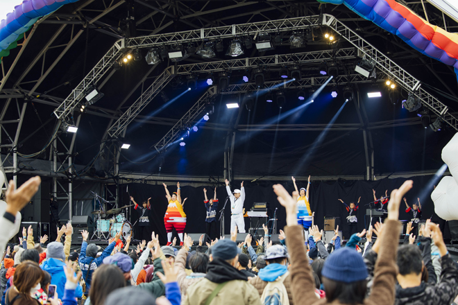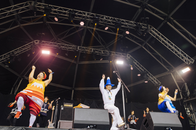 翌朝。富士山の輪郭まで拝める晴天が広がっていた。だいぶ冷え込んでいるものの、少しずつ顔を出す太陽の姿を写真に収めようと6時台から人が続々と集まる。刻一刻と陽光が辺りを満たしていく様子は圧倒的だった。その後、朝霧JAM最大のアクティビティである数千人規模に及ぶラジオ体操には、ケロポンズもフィーチャリングとして登場。ケロポンズが2017年の出演時に朝霧JAM実行委員長とラジオ体操で意気投合し、委員長のオヤジギャグにインスピレーションを得て作られたという楽曲「ツイてる!ツイてる!」、そして代名詞「エビカニクス」をパフォーマンスし、子ども連れを中心に大盛況となった。