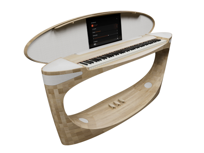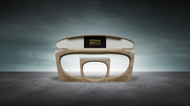 今回発表された創業50年記念コンセプト・モデルは、最新のサウンド・システムを搭載したコンセプト・モデル。ローランドの主要な歴代ピアノの音色に加えて最新の音色も搭載。従来以上に自然なレスポンスを味わえる鍵盤タッチも実現している。カリモク社と再び手を組み設計した一体成型の木製ボディは、過去と未来を融合するイメージでデザイン。国産のナラ材を組み込んだ剛性の高いボディは、スピーカーから出力されるピアノの音色を忠実に響かせる。
