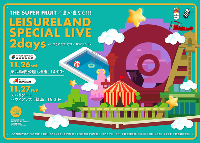 今夏にCDデビューを果たしたつばさ男子プロダクションに所属するTHE SUPER FRUITと世が世なら!!!の2組が、11月26日(土)に埼玉・東武動物公園、11月27日(日)に福島・スパリゾートハワイアンズにて<レジャーランドSPECIAL LIVE 2days -あつまれ今だけスパ世がランド->を開催する。