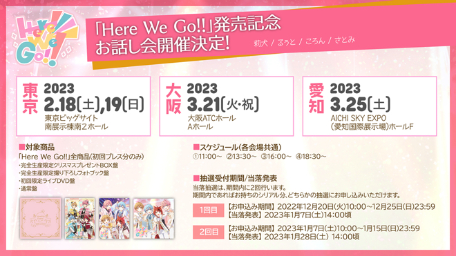 アルバム『Here We Go!!』の全形態(初回プレス分のみ)に封入される申し込みに使えるシリアルナンバーが封入されます。詳細はオフィシャルサイトでご確認ください。