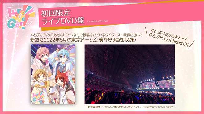全公演がソールドアウトとなった「すとぷり」初の全国5大ドームツアー<すとろべりーめもりーVol.Next!!!!>から、すとぷりのYouTube公式チャンネルに投稿されているダイジェスト映像に加えて、新たに2022年5月に開催された東京ドーム公演より「Prince」「僕らだけのシャングリラ」「Strawberry Prince Forever」の3曲を収録。