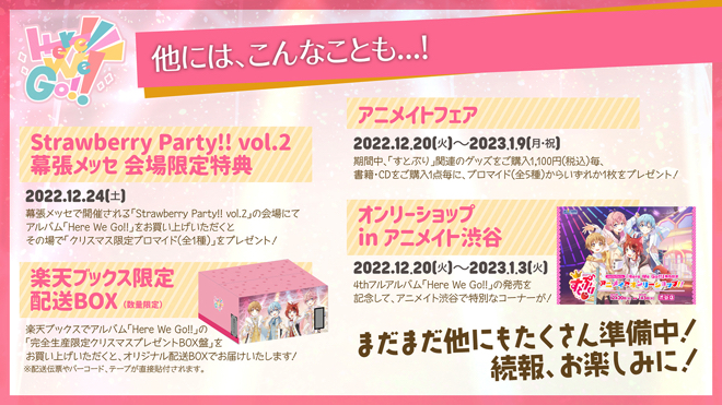 幕張メッセで開催される<Strawberry Party!! vol.2>のライブ会場にて4thフルアルバム『Here We Go!!』を購入した方にその場で「クリスマス限定ブロマイド(全1種)」をプレゼント。