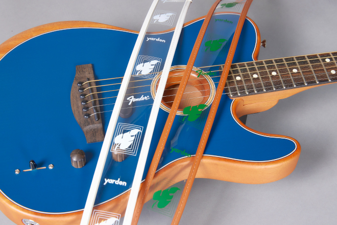 PORIN本人によって監修されたこのストラップは、“光に包まれ風に揺れる花木のように、触れる人たちの日常を豊かに彩る衣服“というyardenのコンセプトをベースに、繊細でいて清涼感と花木がまとう温かみが共存するようなユニークなデザイン。フェイクレザーのパイピングをあしらったトレンド感のあるPVC(ポリ塩化ビニル)素材ストラップに、“Fender”と“yarden”、それぞれのロゴをモノグラム調に表現している。また、ステージで使用することを想定してデザインされおり、幅は一番太い箇所を約55mmに設定し安定感のある仕様となっている。