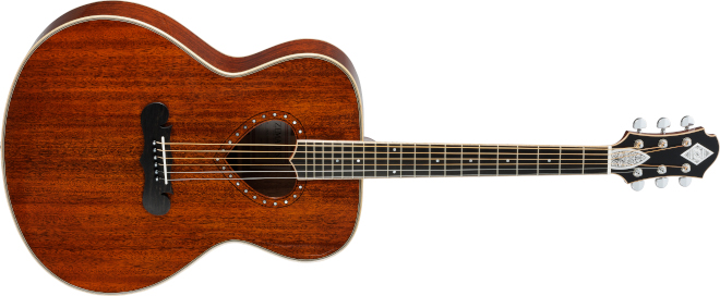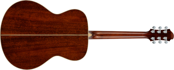 ボディー・トップ、サイド、バック共に単板マホガニーで、Xブレーシングを採用。また、エボニーのブリッジ・ピンや、ヘッドとネックに施されたフレイム・メイプルのバインディング、同じくフレイム・メイプルを基調としたトップとバックのパーフリングやバック・ストリップが高級感を感じさせる。