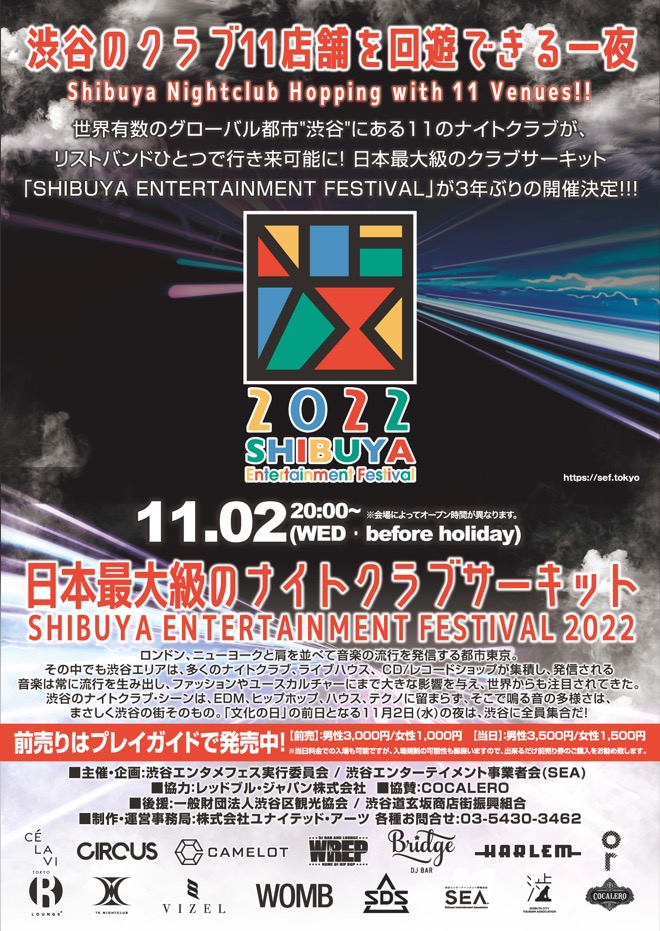 CE LA VI TOKYO / CIRCUS TOKYO / CLUB CAMELOT / DJ Bar & Lounge WREP / DJ Bar Bridge / HARLEM / MIYASHITA PARK OR / R LOUNGE / TK SHIBUYA / VIZEL / WOMB