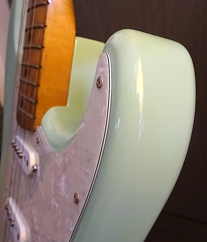 こだわりが詰まったオーダーですね。スクワイアのネックも気合が入っていて良く鳴りそう。ラッカーではなくポリらしさ満載のやれ具合が、70年代ストラトみたいで面白い。ピックガードを垂直カットするのは目からウロコ。こういう発想はなかった。ちょい斜めからみると印象がガラッと変わる美人さんですね。(JMN統括編集長 烏丸)