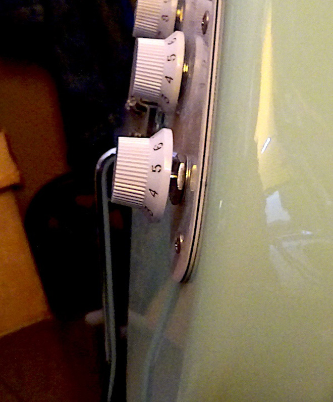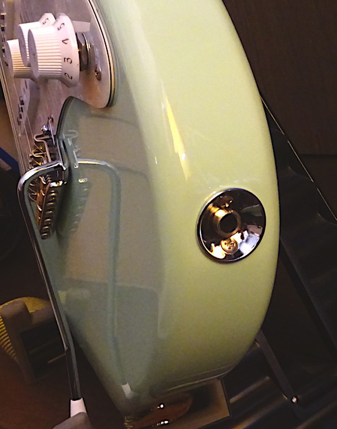 ストラトジャックは抜きにくい/トレモロバーに当たる…常々不満だったのでこれはテリー仕様_サイドジャックに変更。それとスイッチポットを使いRainbow Toneを実現できたのが嬉しいのです。トーンノブをプルすれば常にneck がオン_これでneck-bridgeとN-middle-Bが追加されて7セレクトが可能になりました。NMBの全部盛り=シングルコイル三発でさぞノイジーと想像されましょうが、さにあらず。気持のいいトーンで気に入っています。ノイズの少なさはクラインS-5のmiddleピックアップが逆巻き仕様のためでしょうか。