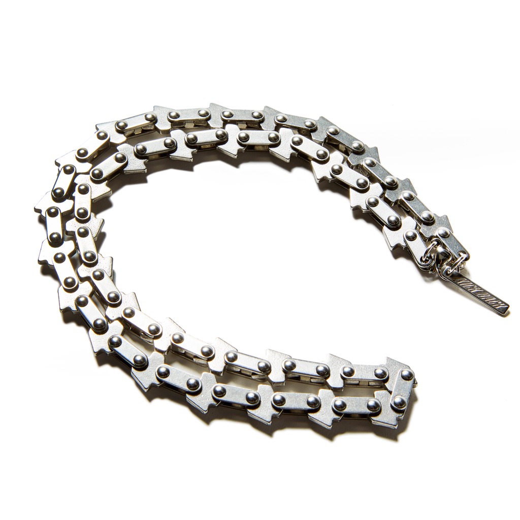 「チェンソー盤」は、蛍光グリーンの円形ケースで、中央にCDが置かれ、その周囲を取り囲むようにチェンソーネックレスが配置された、見た目にも美しく、刃物のシルエットとジャケットの絵柄が相関するようなインパクト大のパッケージ。ネックレスは、チェンソーの刃を表現したステンレス素材で重厚感のある質感となり、男女共に調度良い長さが特徴。