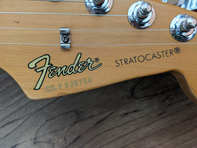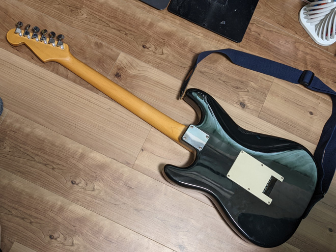 最近、ビンテージらしいという事で調べると、FenderJapanの1987年辺りのものなのですが、どこにも.Made in japanの表示がない、シリアルはネックにあるけど、他は不明。ネックもよく見ると、貼りメイプルと言われる仕様で、これまた謎、ボディは、弁当箱と言われるザグリで、廉価版のそれですが、ネジがズレていたので当て木してるし(不細工なので、自分で修正)、アームの穴は貫通してて、スプリングを使えない。