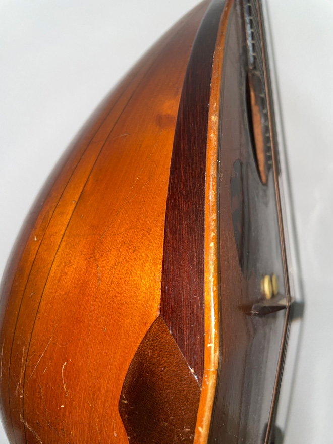 裏の材はメイプルに見えますが戦前のものということでよくわかりません。ペグも弦かけもその当時の物だと思われます!元は金色だったんですねたぶん牛骨のナットで、指板とサウンドホール周りの貝もキレイです。ボディのクラックもすごい!どんな角度から見ても風格を感じます。バインディングやボディの縁の木の細工にまでローズウッドや黒壇がふんだんに使われています!80年前だからできたことでしょう泣。いずれ綺麗なマンドリンの弦を張って本領を発揮してほしいです!
