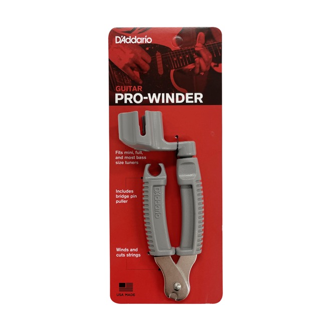弦の張り替え作業に必要となるストリングクリッパー(カッター)とワインダー、ブリッジピン抜き機能が付いたハンドルなど、1本3役とコストパフォーマンスも高いPro-Winderは、D’Addarioギターアクセサリーのトップセラーアイテムとなっている。