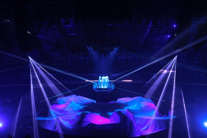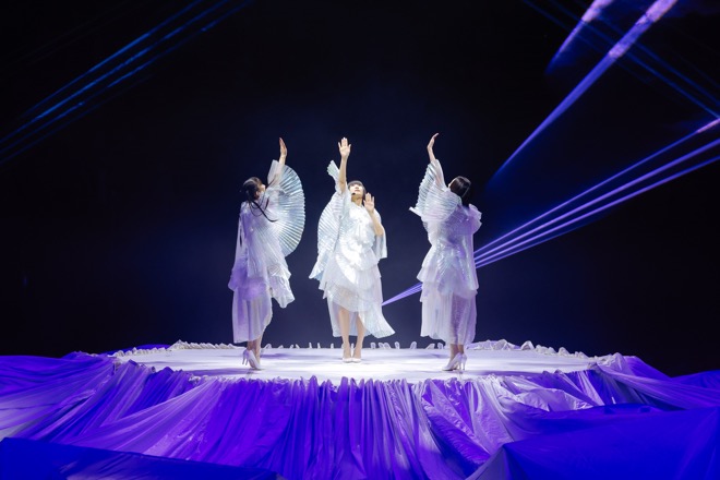 会場の長辺いっぱいに長く伸びたステージは、本人たちが「みんなをより近くに感じたい」と望み、360度を客席に囲まれた全方位仕様。その中央に位置する大きな円形ステージ上方には、同じサイズのライトリングがあり、他はすべて白い布で覆われていた。重低音とともにその全体が神秘的に染まり、深海か宇宙空間かというような呼吸音が。すると、ライトリングが上昇。「Plasma」の衝撃音で白い布がとりはらわれると、まさに今、地上に降り立とうとする3人がゴンドラに乗って輝いていた。いきなりの生身。そして、純白の衣装。何も飾らない、何も怖くない、何色に染められてもいい。そんな潔さを象徴するようなオープニングだ。