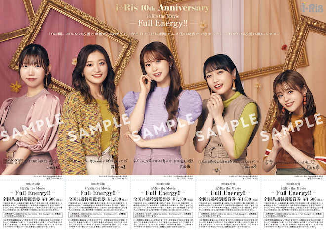 ベストアルバム、10周年ライブに続く『10周年記念プロジェクト』として“アイドル自身が劇場版アニメ化される”映画のタイトルは『i☆Ris the Movie – Full Energy!! -』。会場&ECサイト限定で「i☆Risメンバー手書きコメント入りのスペシャル劇場前売り券」の最速プレミアム発売も実施されている。このチケットはベストアルバム『10th Anniversary Best Album ~Best i☆Rist~』で用いられているi☆Risの集合カットによる5枚綴り券となっており、各メンバーの手書きコメントも載せられているなど、10周年記念のこのタイミングでしか入手できないスペシャルなチケットとなっている。ECサイトでは11月8日正午まで購入が可能だ。なお、作品の詳細については追って発表される。
