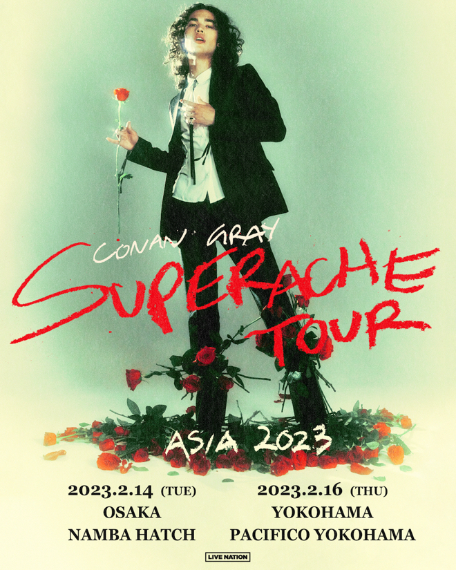 コナン・グレイは現在、最新アルバム『スーパーエイク』のリリースに伴うライブ・ツアーを開催中。日本では2月14日の大阪・なんばHatchと16日の神奈川・パシフィコ横浜 国立大ホールの2公演が行われる。
