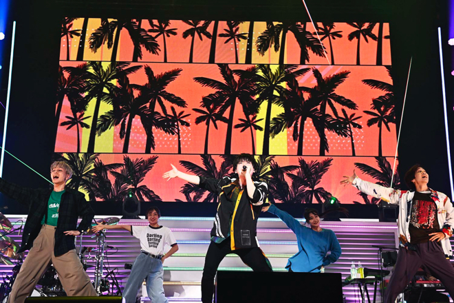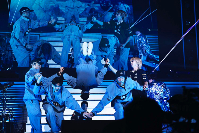 「DNA」では、同曲のミュージックビデオにも登場したブレイクダンスチーム“KOSÉ 8ROCKS”が登場し、クールなブレイクダンスで会場を魅了する。続く「Relax」ではダンサーと共に息の合ったパフォーマンスを披露した後、「BE MY BABY」のバンドセッションコーナーへ。