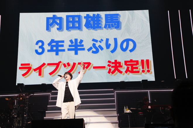 ストリートテイストの衣装で内田がステージに戻ると、「your words」「FROM HERE」と続き、その後のMCでは「何よりも、このパフォーマンスを受け止めてくれる“あなた”がいるから、今、内田雄馬はここにいます」とファンへの大きな感謝を語り、1stシングル「NEW WORLD」を今度はバンドを従えて再び歌唱。シームレスに「Congrats!!」へと繋ぎ、本編最後の楽曲「Echo」へと続く。この2曲は事前にファンからコーラスや掛け声のボーカルデータを集め、無発声な会場の中でもファンとの一体感が表現される演出が繰り広げられた。これからの未来を祝福するように明るい歌声を響かせた後、彼はステージをあとにした。