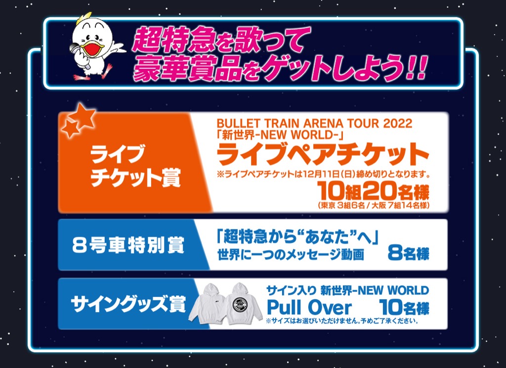 ライブチケット賞:BULLET TRAIN ARENA TOUR 2022「新世界 -NEW WORLD-」ペアチケット…10組20名様 (東京3組6名/大阪 7組14名様)