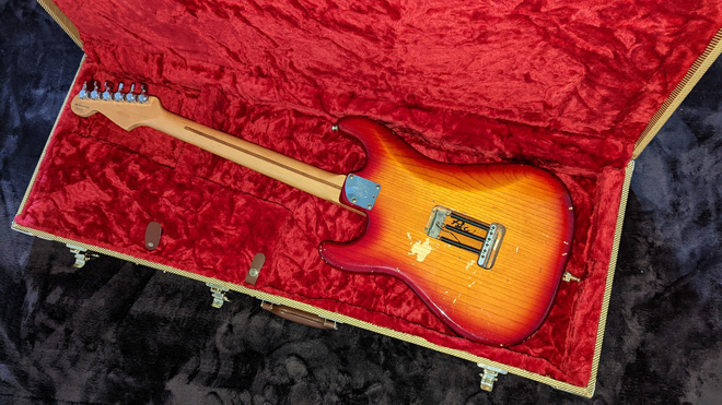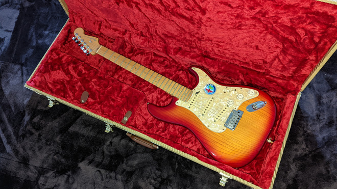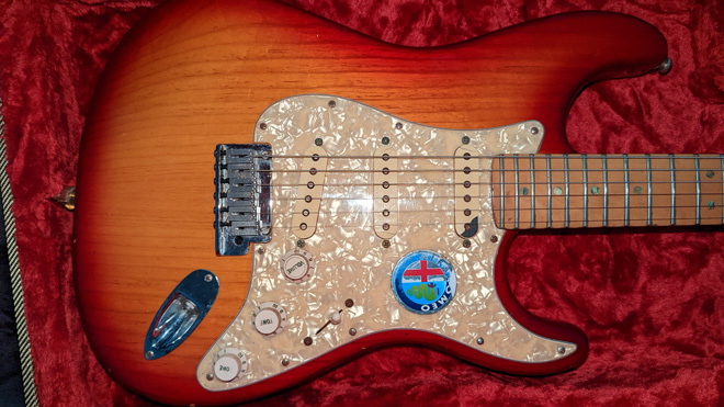 十年くらい前に一目惚れして購入したウチで一番の綺麗所。写真用に派手なケースに入れてデラックス感を出してますが、7万円ほどで購入したのは買い物上手。ピックアップをVanzantにしたりRio grandeに換えてみたりしましたが、結局元々着いてたピックアップにしています。最近、Texas specialに換えたくなってますが今の状態が気に入ってるので、もう一本ストラト買おうか悩んでます笑