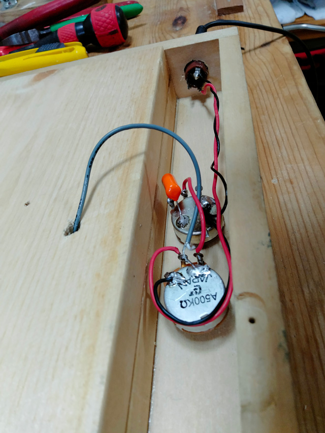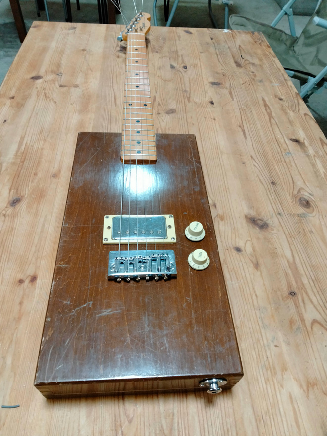 油絵具用の木箱でギターを作りました。1号はやや厚すぎて体にフィットしない感じだったので、今回の2号は、通常のエレキギターぐらいの厚みにしました。2022年9月に完成したばかりです。弦高やオクターブピッチもバッチリ合わせたので、ライブなど実戦で使おうと思っています。