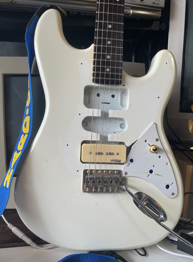 宅録専用ギター、なんていうと特別感がある気もしますが、実際にはストラトのボディにWilkinsonのP90と自動車用のトグルスイッチを取り付けただけのかなり簡素なものです。最初はスイッチ無しの完全直結仕様にしてみようかとも思いましたが、なんとか思い留まってスイッチだけは載せることにしました。フランケンストラトを目指したわけではありませんが、最低限を目指すと皆こんな見た目になって行くんだと思います。