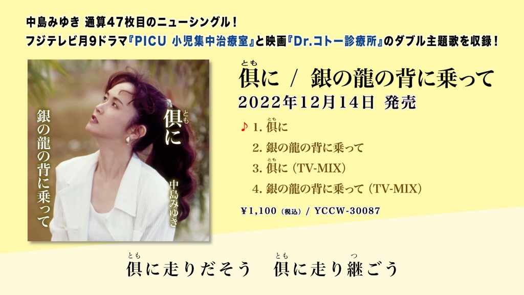 「倶(とも)に 」は、中島みゆき初担当となる月9ドラマ『PICU 小児集中治療室』の主題歌。リリースにあたっては12月16日に公開される映画『Dr.コトー診療所』の主題歌「銀の龍の背に乗って」を収録したダブルタイアップシングルとなった。
