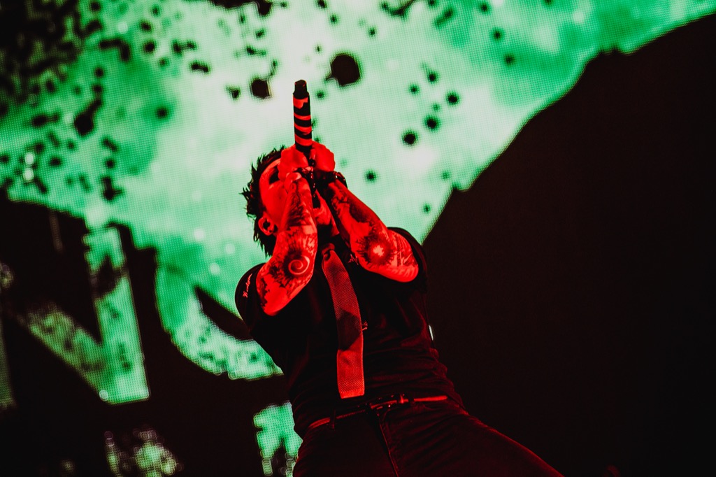 歌いながらMAHが左右に腕を振れば、アリーナはもちろん、スタンド席のオーディエンスも立ち上がって腕を左右に振る。「頭を振れ!」とMAHが叫べば、GODRi(Dr)の刻む激速グルーブに合わせ、上半身を折り曲げるほどのヘドバンも客席全体に生まれる。ベースをブン回しながら弾くSIN(B)やステージ最前でリフを刻むSHOW-HATE(G)が、オーディエンスのヘドバンを激しくさせてゆく。また3曲目「Dance In The Dark」では、いやらしく腰をうねらせる仕草まで。オーディエンスの様々なうねりを、SiMは完全にコントロールしながらライブは突き進む。