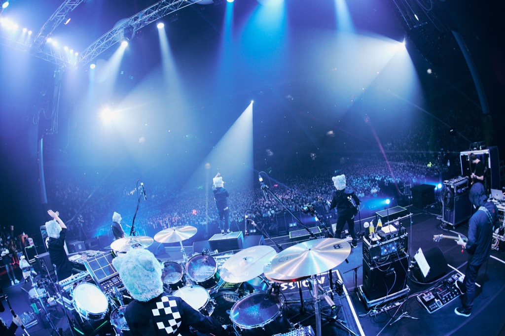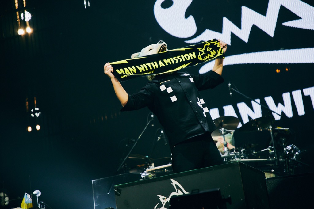Jean-Ken Johnny(G, Vo)などメンバー達が重ねるシンガロングに手を振り始めた観客の反応が、演奏の音数が増えるにつれ、手拍子から振り上げた拳に変わっていった1曲目の「Emotions」。そこから「ソーイ!ソーイ!」とTokyo Tanaka(Vo)が声を上げながら繋げた、エモーショナルでアンセミックな「higher」。この時点でアリーナはもちろん、総立ちになったスタンドも含め、観客はすでに大歓迎モード。観客の多くがMAN WITH A MISSIONの登場を待ち焦がれていたことは一目瞭然だった。懸命に手を振りながらバンドの演奏に応える観客の姿に、メンバー達もそれを感じ取ったのだろう。バンドの総意を代表して、「最高だ!」とJean-Ken Johnnyが声を上げた。
