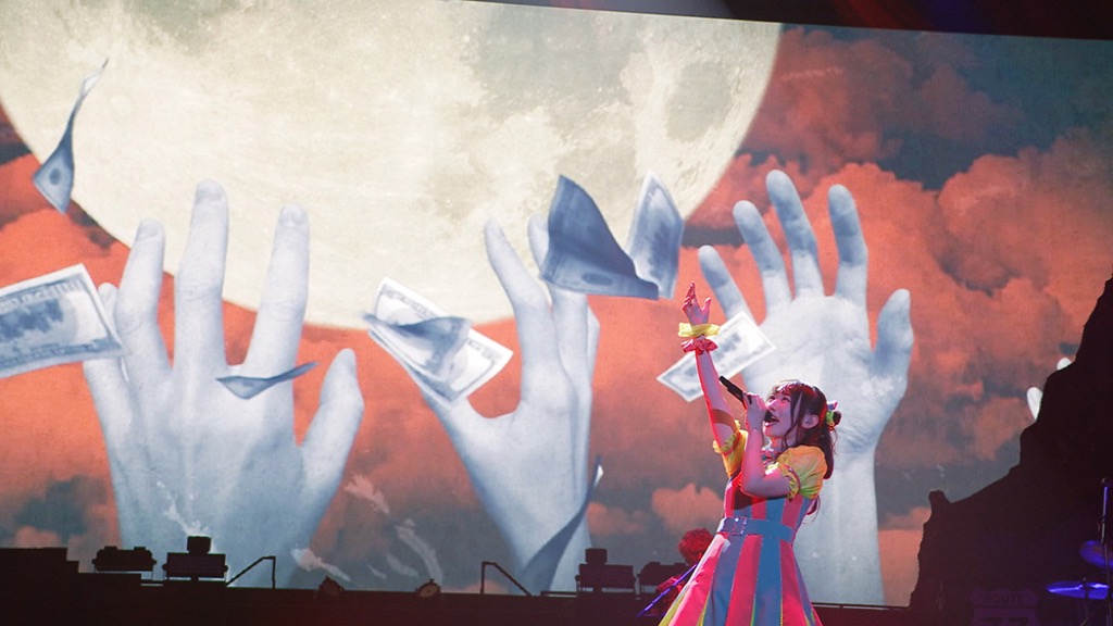 今ツアーでライブ初披露となった「ダブルシャッフル」は軽やかでトリッキーなサウンドと畳み掛ける歌詞が特徴的な楽曲だ。間奏ではシャウトした水樹が満面の笑みを浮かべながらスカートを翻し踊る姿はライブならでは。転調を繰り返す難しい楽曲でありながらも、激しく体を揺らしながら歌い上げる圧巻のパフォーマンスにぜひ注目してみてほしい。