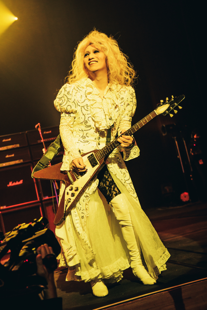「コール&レスポンスではない、光の海という筋肉少女帯のライブが完成された、重要なツアーだったと思うんだよね」(大槻)と今ツアーを振り返ってからの終盤は、その“光”の威力を鉄板曲で思い知らされることとなった。「イワンのばか」で正確無比なビートを刻む長谷川、大胆かつ華麗に鍵盤を奏でる三柴、勢いよく掛け声を放ちながら輝くペンライトでベースを弾く内田、客席を見渡して体中でコミュニケートする本城、頭だけでなくギターもブンブン振り回して舞う橘高とくれば、オーディエンスは熱狂。体感温度も一気に上がり、さらに「君よ!俺で変われ!」から「サンフランシスコ」へと雪崩れ込めば、待ってましたとばかりに突き上がるペンライトの勢いも半端ない。そして橘高と本城がポジションをスイッチすれば、上手がピンク、下手が青と、それぞれ迎え入れたギタリストのカラーに客席が染まるという衝撃的な光景が! さらにベースソロへと続くと内田カラーの緑にチェンジして、目に見える形でライブに参加するオーディエンスの柔軟性たるや、お見事の一言だ。