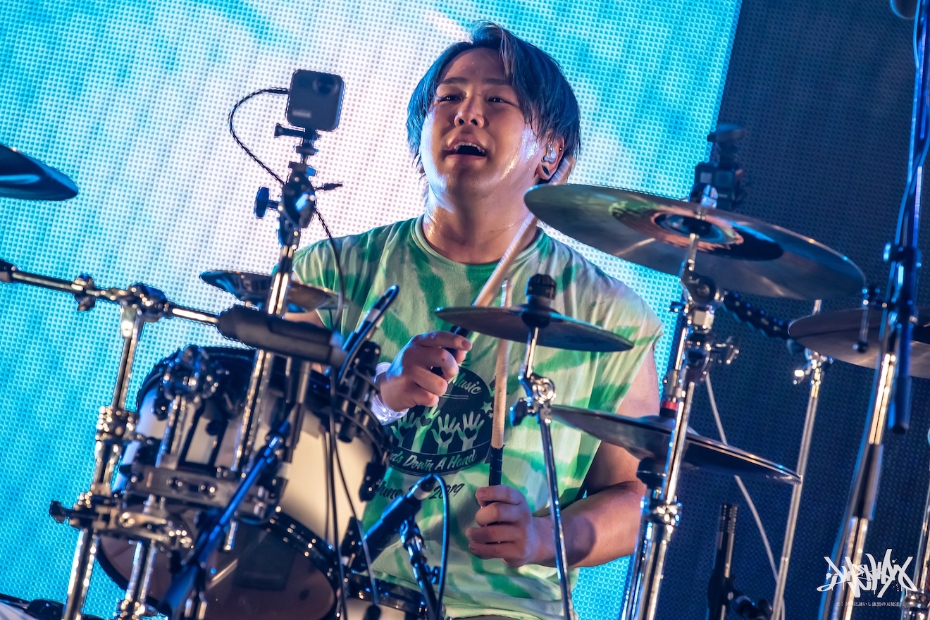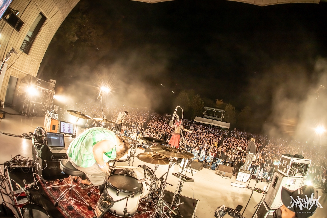 続いては、東海オンエアのてつや&としみつをフィーチャーして今年6月にリリースした配信シングル曲で、ともやんのスラップ奏法がクールに唸る「MUSIC Zoo」。「もっともっとアゲていきたい!」という小柳の煽りから、dip バイトル タイアップ曲「時給アップアップソング」と、ノリのいいコーラスとセリフパートを含む賑やかなナンバーを、ミュージックビデオの映像も交えてポジティブに投下。客席にヘドバンがあふれる盛り上がりで、野音を大いに沸かせてみせた。