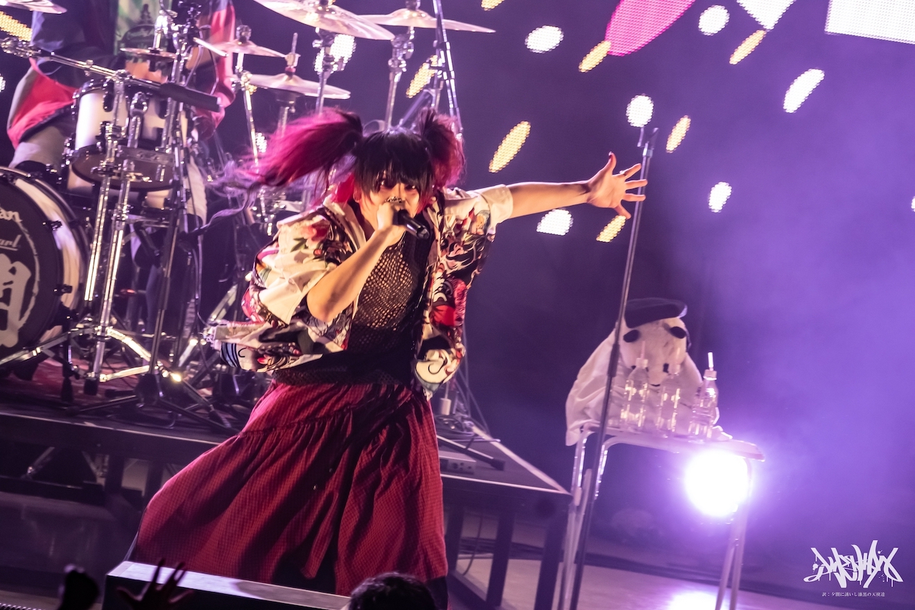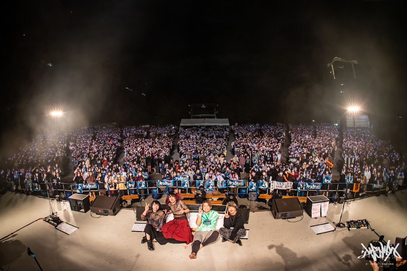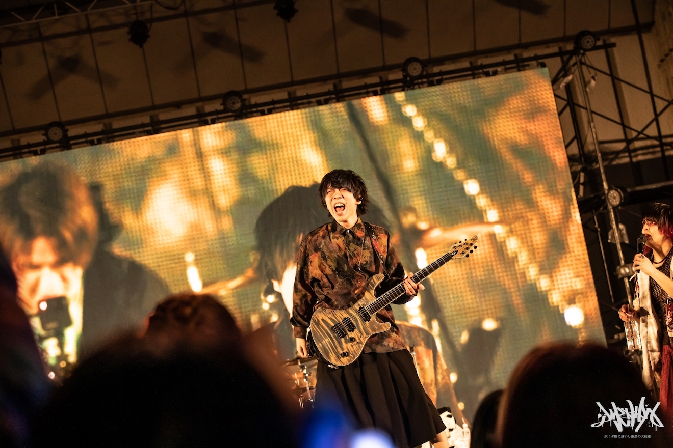 動画クリエイターとしても活躍するコミック系ラウドバンド、夕闇に誘いし漆黒の天使達が11月27日(日)に東京・日比谷野外大音楽堂でワンマンライブ<めっちゃ外 〜卒業〜>を開催した。