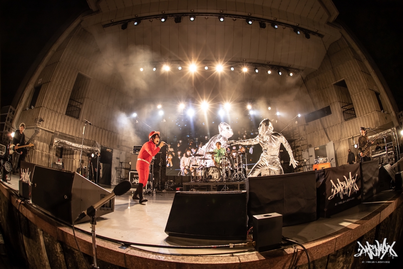 「野外でワンマンの経験がないので慣れないんですけど、何事もなくこのイベントが終わればいいなと思っております」という小柳のフリから、突然の落下音が響きわたる → 確認に向かった千葉がアダムスキー型の(?)宇宙人に轢かれて絶叫 → 外だから宇宙人が入ってくることも考えておかないといけない → 小柳が車のフロント部の模型を抱えて歌う「危険予測ディスカッション」が始まる → そのまま“車つながり”で「はたらく君に贈る歌」になだれ込むなど、ライブ中盤はコミックバンドとしての本領を発揮し、幕間映像やコントもたっぷりの構成で楽しませてくれる。