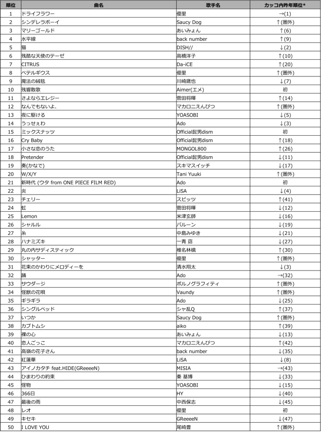 * 昨年51位以下の曲は「圏外」と表記