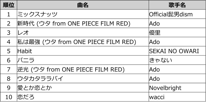 今年発売楽曲では、TVアニメ『SPY×FAMILY』の主題歌に採用されたOfficial髭男dismの「ミックスナッツ」が1位を獲得した。映画『ONE PIECE FILM RED』の主題歌「新時代 (ウタ from ONE PIECE FILM RED)」を歌ったAdoは、同曲を含む4曲同時ランクインを果たしている。