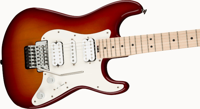Charvel Pro-Mod So-Cal Style 1 HSH FR Mは、40年にわたるギター製作の経験を活かし、ギタリストが喜ぶモダンな機能と多彩なサウンドを備えた洗練されたモデル。ハイスピードな演奏とSo-Calスタイルへの愛から生まれ、Charvelを名門ブランドへと持ち上げたクラシックな演奏性と革新的なデザイン。アルダー材を使用したSo-Calスタイルのボディに、グラファイト補強ロッドを備えたボルトオンメイプルネックを組み合わせて、快適な演奏を実現。ヒールマウント式スポークホイールにより、容易にトラスロッドの調整を行うことができる。軽快な演奏に適したネックシェイプと12~16インチのコンパウンドラジアス仕様の22Fメイプル指板は、ローポジションでのリフプレイからハイポジションでの高速リードプレイまで、あらゆるスタイルの演奏に対応。今回、Cherry Kiss Burstのフィニッシュでの登場となる。