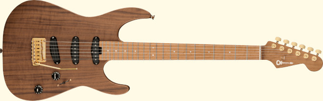 本モデルは、Charvelならではの傑出したスタイリングとスケール感のあるトーン、そしてモダンで高次元のパフォーマンスを内包したモデル。マホガニーDinkyTMボディにフィギュアドウォルナットトップ、シュレッダーズヒールカット、および1弦側カッタウェイ部内側の深めのコンターカットを施している。キャラメライズドボルトオンメイプルネックは、グラファイト補強ロッドを内蔵し強度を確保するとともに、サテンウレタンバックフィニッシュにより気品のあるプレイアビリティを実現。12~16インチコンパウンドラジアスのキャラメライズドメイプル指板は、快適なエッジのロールオフ処理が施されており、22本のジャンボフレット、パーロイドドットインレイ、Graph Tech TUSQ XLナットを特徴とする、高速プレイに適した設計になっている。
