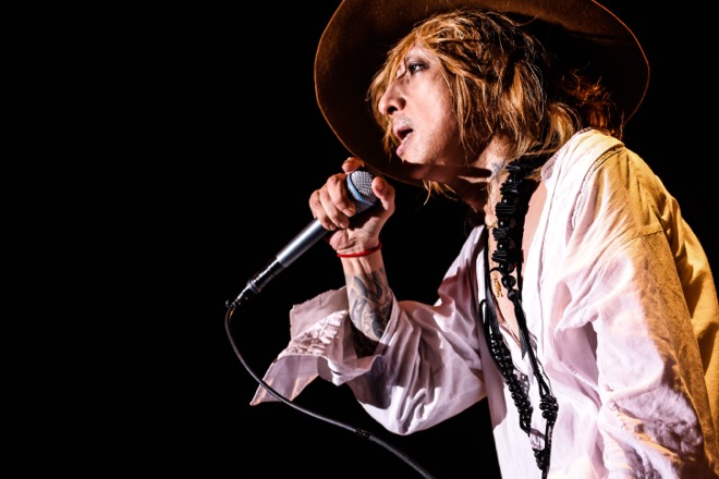 衣装を変えた清春が再び登場し、オーディエンスのフォーカスがまた主役へともどる。『夜、カルメンの詩集』から2曲をまたゆったりと歌い上げ、ライヴにおける代表曲「JUDIE」へ。キックの低音に牽引され、会場の熱量も一気に上がっていく。清春から投げかけられる言葉──「簡単じゃん」「手を伸ばして」。そう、踏み出すだけ。簡単なことなのだ。今、この国ではその簡単な行為をも制する空気が満ち溢れている。沢山のオーディエンスが手を伸ばして、“生きる”を求める態度を示す。