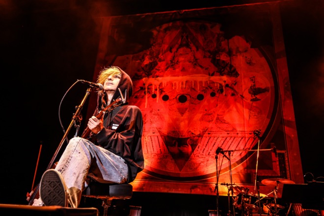 恵比寿ガーデンホール公演<The Birthday>では、ここ最近の最重要プレイヤーとなっているギターのDURAN、チェロにRobin Dupuy、そこにライヴでは初の試みとしてパーカッションの中北裕子が加わった編成。開演のSEが鳴り、間合いをはかるように3人の音がレイヤードされていく。有機的な音の響きに会場が飲み込まれて、清春の登場。オーディエンスは手を掲げ、求める。そして「下劣」からスタート。