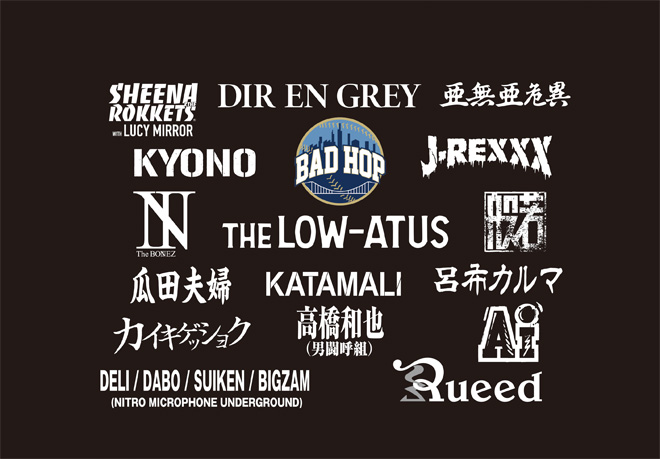 ヒップホップ/レゲエ/R&B勢も負けちゃいない。重鎮・Zeebraを筆頭に、般若、AI、J-REXXX BAND、呂布カルマ、そしてBAD HOP。単独でもアリーナを満杯にできるメンツが集い、ロック勢としのぎを削る。昨今のMCバトルでトップを極めた猛者たちが、共演者だけでなく、客席にいる古参のロックファンにもバトルを挑む。ライブはパーティーでありバトルでもある、ヒップホップ勢のステージ美学は初めて見る観客にとって大きな刺激になるだろう。あらためて、凄いメンツだ。