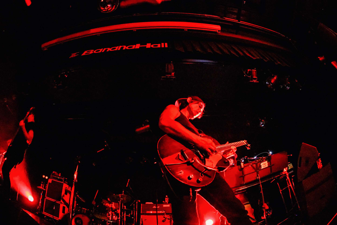 満場のBananaHallにいつもの「Over the Rainbow」のSEが流れるや、大きな拍手で出迎えるオーディエンス。ブルーの照明に包まれメンバーが登場し、爆発寸前の期待感を焦らすかのような「Smoothie Glider」で、じりじりと深淵に引きずり込む幕開けに。そんな緊張感を切り裂き、「ハロー、大阪エンジェルス。レッツパーティー!」と“ベンジー”こと浅井健一(Vo, G)が開口一番、エッジィなギターもろとも「HIGH SCHOOL」へ突入。一気に解き放たれた熱気はあっという間に急上昇、たった2曲で唯一無二の静と動を突き付けた後も、その躍動は止まらない。福士久美子(Key, Cho)のシンセが楽曲の世界観を拡大する「RUSH」でも、急転直下のダイナミズムで観る者を圧倒する。