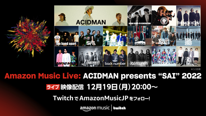 ACIDMANが埼玉・さいたまスーパーアリーナで開催したロックフェスティバル<SAITAMA ROCK FESTIVAL “SAI” 2022>の特別番組が、12月19日にTwitch上のAmazon Music Japanチャンネルで生配信される。