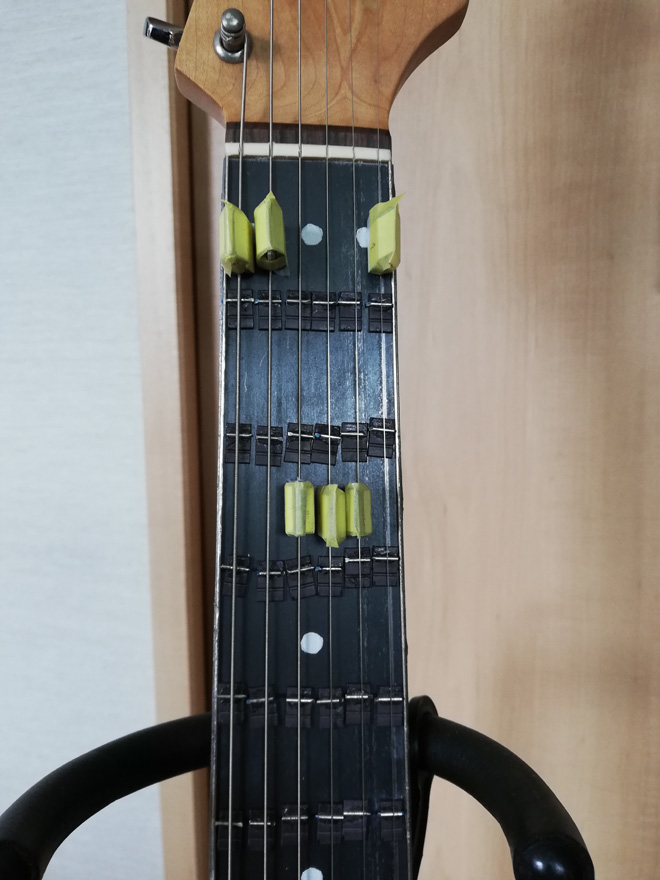 フレットはマグネット・シート。カポはネオジウム磁石。01~03の写真では判りやすい様にフレットの位置をだいたい揃えてありますが、もちろん好きな位置に移動できます。